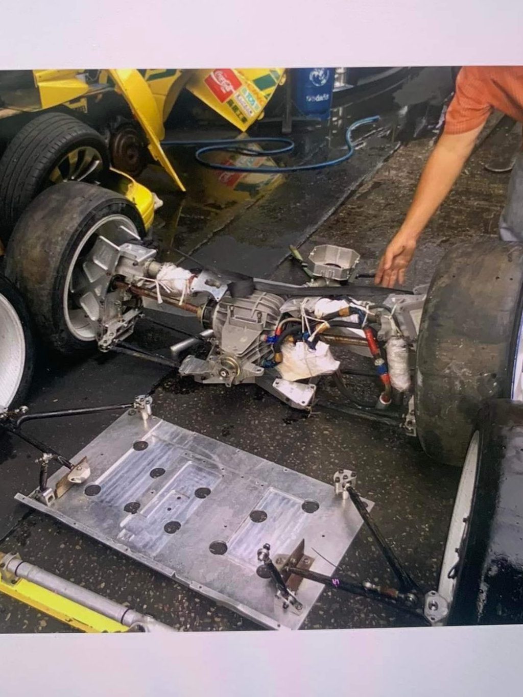 Overall height was 1260mm, length of the car was 4340mm utilizing a 2520mm wheelbase and total weight was approximately 1000kg. Front track width is 1800mm, rear is 1760mm. Brembo 8 piston front calipers, 4 piston rears were tucked inside 18″ Enkei center lock wheels with Bridgestone Advan tires. The fuel tank was a 40L but no photos exist. Suspension on this car is quite wild, Kayaba and later Penske dampers were used on the seemingly custom machined upright assemblies, much of the overall design looks to be similar to era WRC imprezas and possibly utilize some parts from those as well. Front end oddly maintains a mcpherson layout, the lower control arms mounted to a billet plate assembly under the car that looks to also mount the engine to the trans plate/bulkhead, assuming due to the height of the car and location of the engine in the chassis. Oddly the steering rack is high in the engine bay and ahead of the axle centerline but is a rear steer knuckle, assuming again due to drivetrain packaging. I cant imagine this was a well steering car. The rear suspension again followed similar layout to the OE design with a trailing arm/lateral link setup albeit significantly different geometry. The uprights look to be sandwhiched between billet plates, lower strut mounts being at the top side next to the tire with the struts landing in a similar location to an OE car. The rear diff bulkhead looks to be the crossmember that the suspension is bolted to, all one unit. The body, aside from the obvious looks to be pure functional modifications to fit the tires and how they need to move about the wheel wells. Molded overfenders, most likely fiberglass since that was the go-to material for the era, the later Yellow utilized a rear airfoil mounted to the hatch, smaller mirrors on the doors to cut drag and surprisingly for how wild the car was it looks to use factory hood/scoop/vents, bumper, lights, grille and turn lamps but im sure rulesets of the era would dictate what needs to stay on the car.