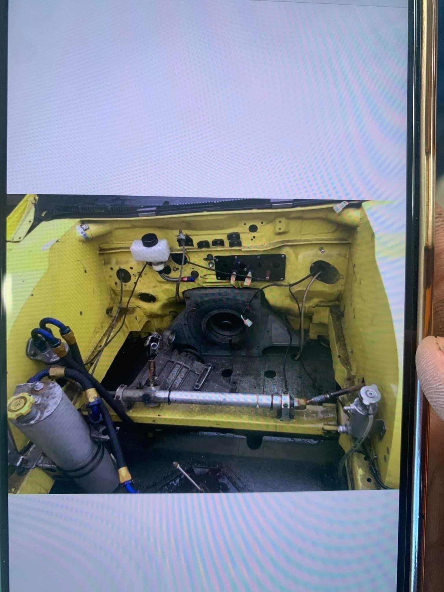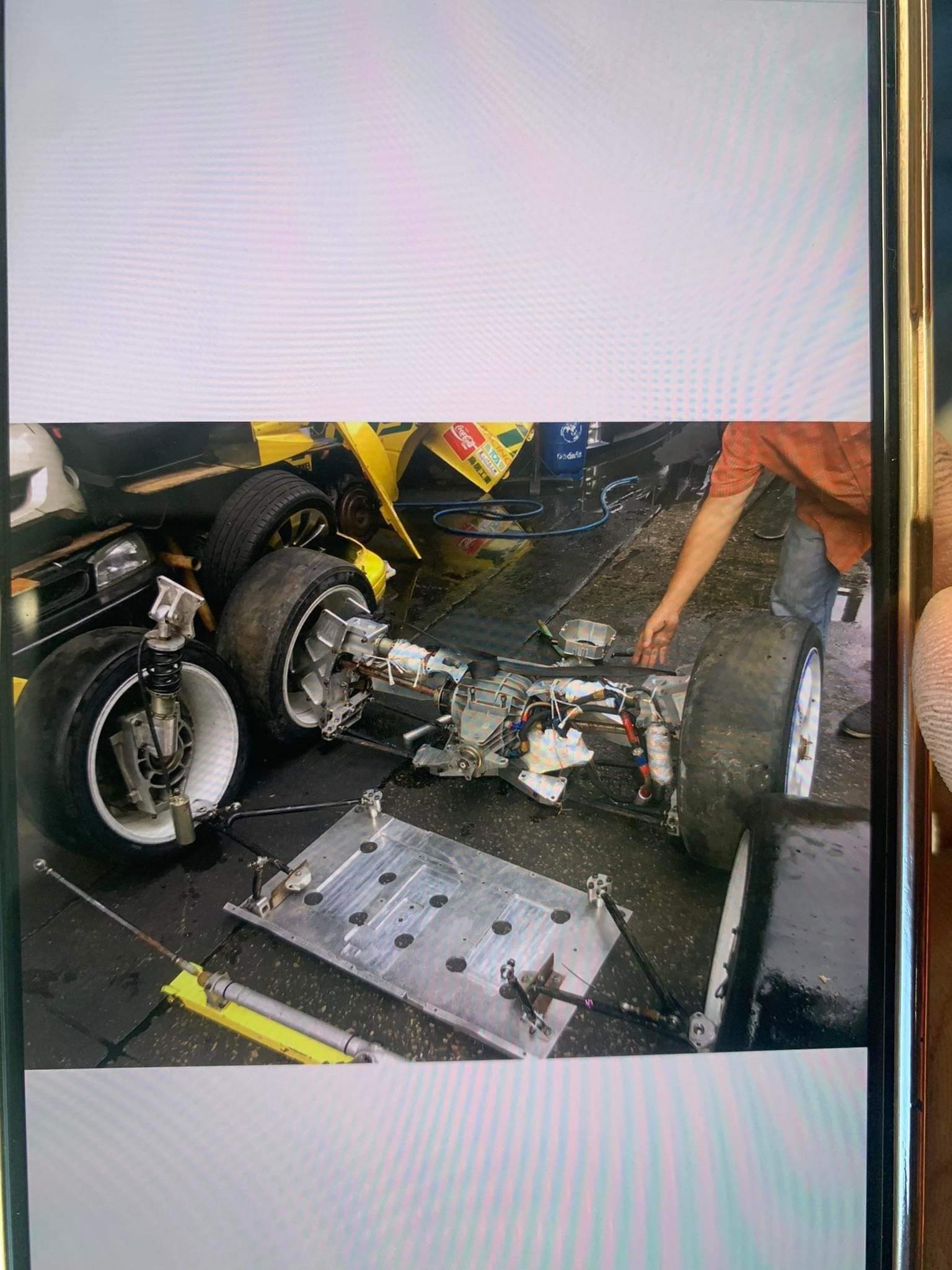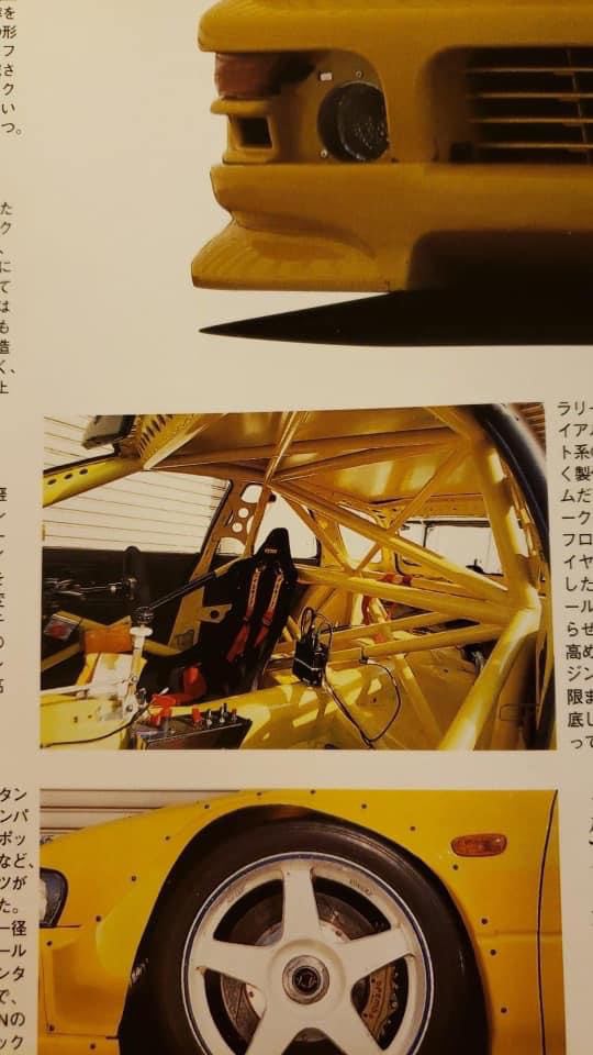Overall height was 1260mm, length of the car was 4340mm utilizing a 2520mm wheelbase and total weight was approximately 1000kg. Front track width is 1800mm, rear is 1760mm. Brembo 8 piston front calipers, 4 piston rears were tucked inside 18″ Enkei center lock wheels with Bridgestone Advan tires. The fuel tank was a 40L but no photos exist. Suspension on this car is quite wild, Kayaba and later Penske dampers were used on the seemingly custom machined upright assemblies, much of the overall design looks to be similar to era WRC imprezas and possibly utilize some parts from those as well. Front end oddly maintains a mcpherson layout, the lower control arms mounted to a billet plate assembly under the car that looks to also mount the engine to the trans plate/bulkhead, assuming due to the height of the car and location of the engine in the chassis. Oddly the steering rack is high in the engine bay and ahead of the axle centerline but is a rear steer knuckle, assuming again due to drivetrain packaging. I cant imagine this was a well steering car. The rear suspension again followed similar layout to the OE design with a trailing arm/lateral link setup albeit significantly different geometry. The uprights look to be sandwhiched between billet plates, lower strut mounts being at the top side next to the tire with the struts landing in a similar location to an OE car. The rear diff bulkhead looks to be the crossmember that the suspension is bolted to, all one unit. The body, aside from the obvious looks to be pure functional modifications to fit the tires and how they need to move about the wheel wells. Molded overfenders, most likely fiberglass since that was the go-to material for the era, the later Yellow utilized a rear airfoil mounted to the hatch, smaller mirrors on the doors to cut drag and surprisingly for how wild the car was it looks to use factory hood/scoop/vents, bumper, lights, grille and turn lamps but im sure rulesets of the era would dictate what needs to stay on the car.