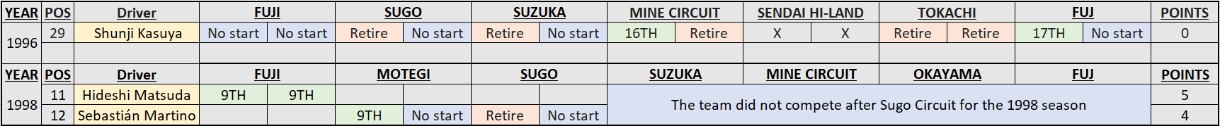 1996: The car in its early green liveried iteration is used for the 96 season. The team misses the first Fuji event, Shunji Kasuya drives the second event, Sugo. The car breaks down about 5 laps into race one, it doesn’t make the second race. Qualify’s last at Suzuka, breaks down in race one, misses race two. At Mine Circuit Kasuya finishes race one in last, breaks in race two. Team skips the Sendai event, later attening Tokachi and breaks in both races. Final event at Fuji the car finishes last in race one, breaks in race two.