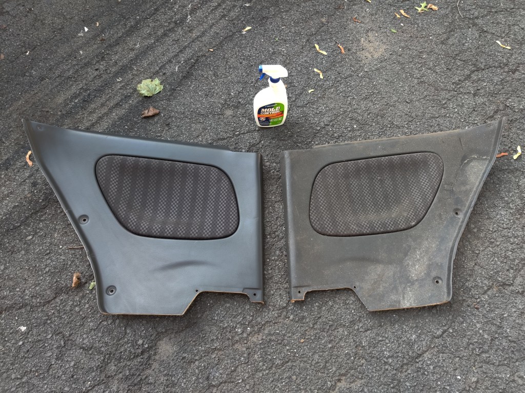 I dug out some moldy door cards to sell, I tried out some Concrobium Mold Control after seeing a few people use it on youtube and let me tell you this shit works great! Spray on, let it sit a minute, light scrub and a wipe. The really bad sections that had an ecosystem science project growing on it required three applications, but after the heavy stuff is scrubbed you can watch the brown/black muck drip right off. The product does leave a thin residue that protects from further mold growth, but a quick wipe with a cleaner or detailer will remove that. No vinyl or fabric was hurt in the making of these photos.